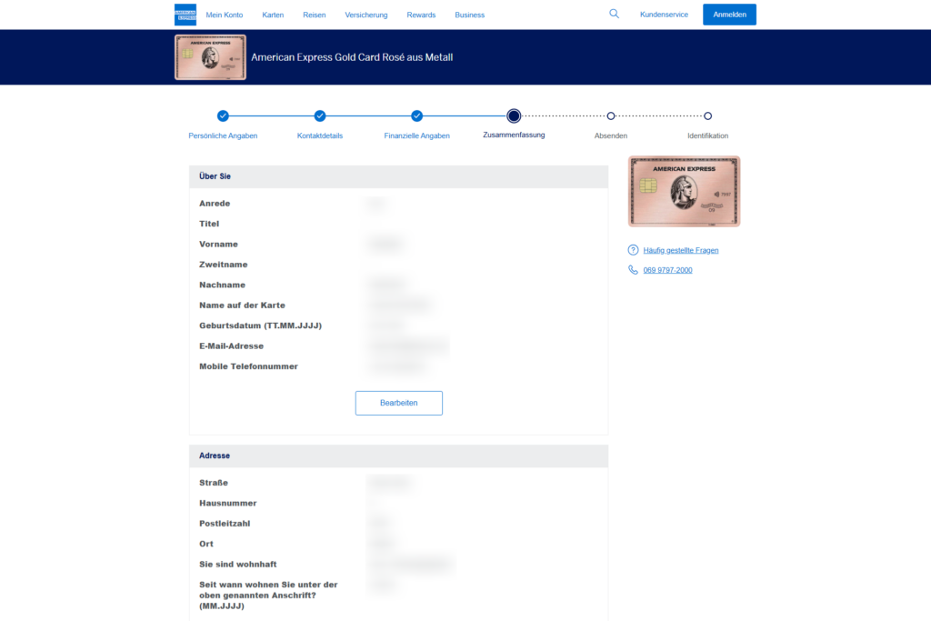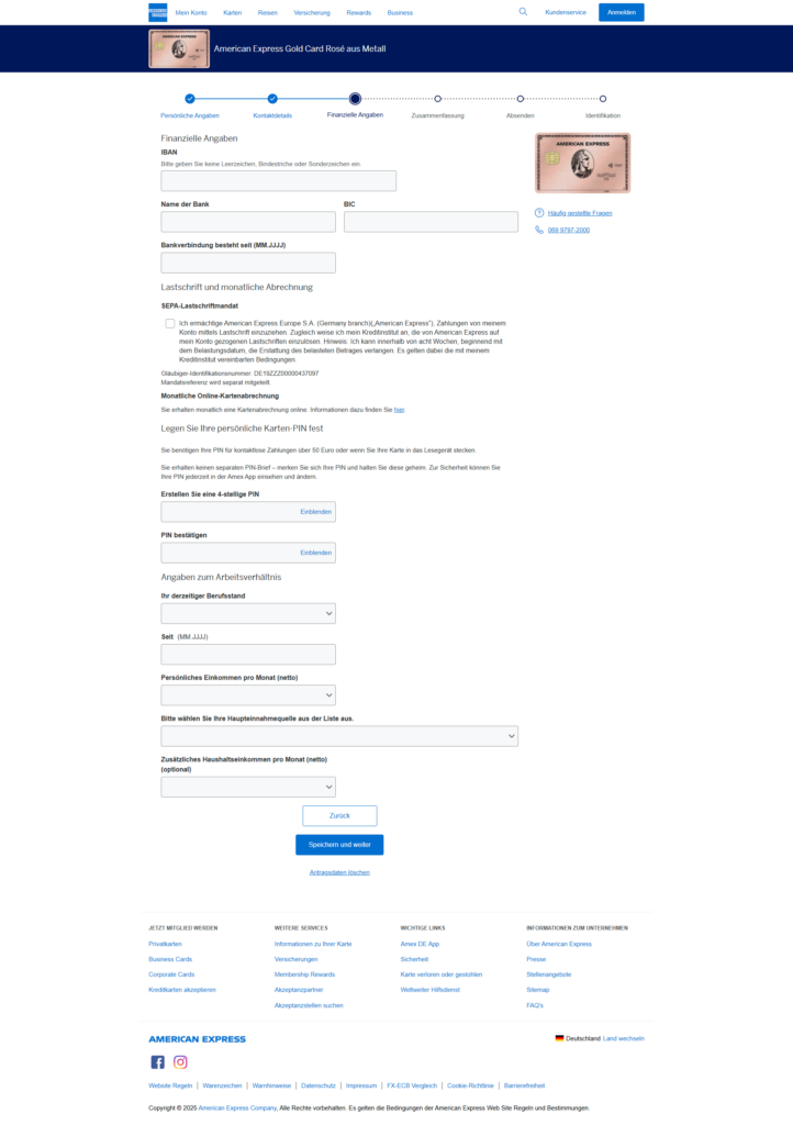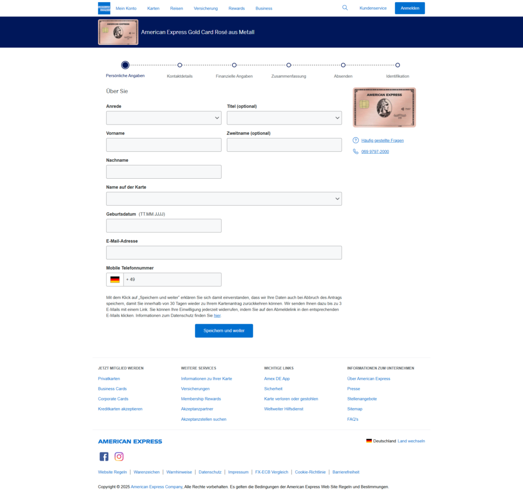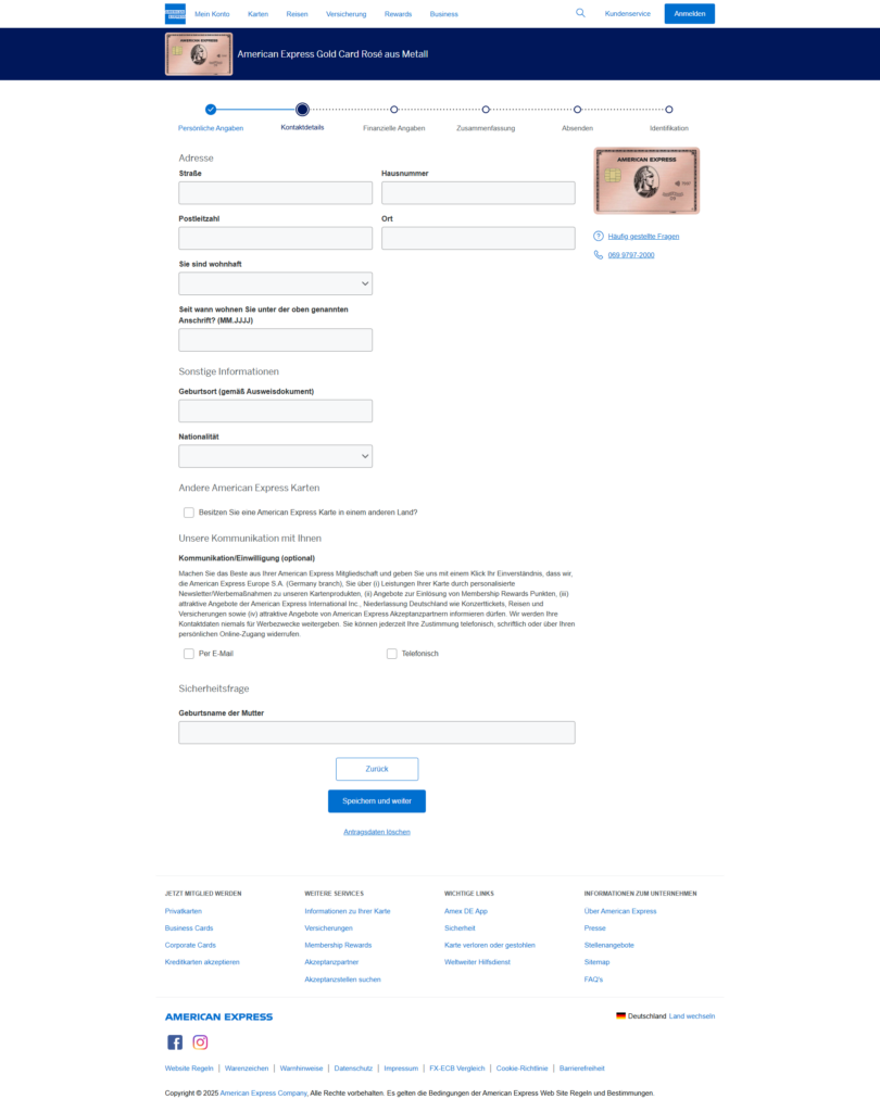 WeiterNur noch einen Klick entfernt – Die American Express Gold Card Rosé jetzt beantragenDen Anfang machen der Name und die Kontaktdaten, also die E-Mail-Adresse und die Mobilfunknummer. Seite zwei des Antrags für die American Express Gold Card Rosé umfasst die Anschrift, die Nationalität und die Antwort auf eine Sicherheitsfrage (Geburtsname der Mutter). Danach müssen bereits die Bankverbindung, eine frei wählbare persönliche Identifikationsnummer (PIN) für die Kreditkarte sowie die beruflichen Eckdaten samt Einkommen und möglicher weiterer Einkünfte hinterlegt werden.