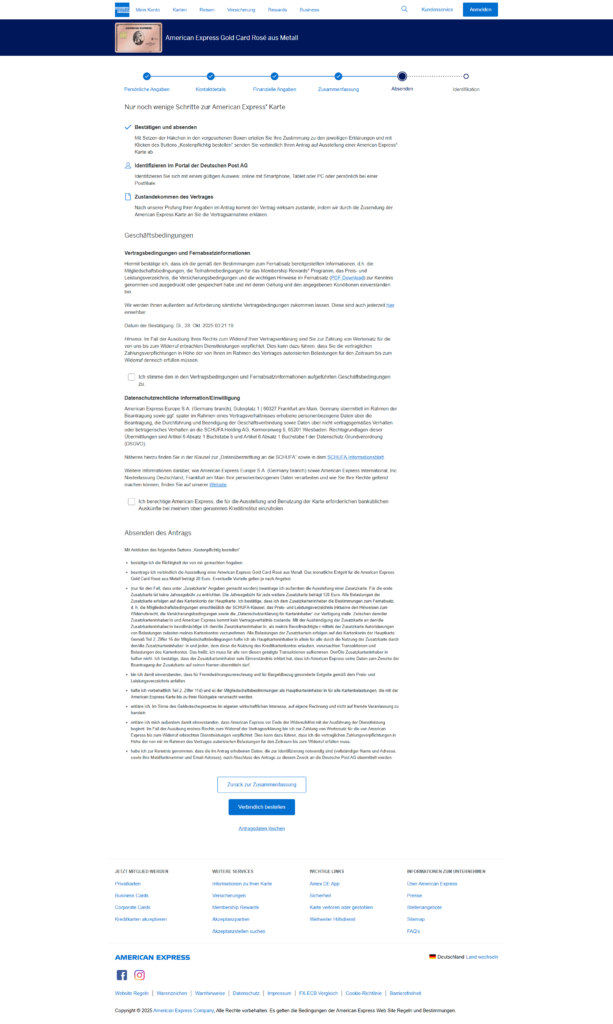 Das System fasst dann sämtliche Daten noch einmal zusammen. Sie können bei Bedarf korrigiert werden. Der vorletzte Schritt listet die Geschäftsbedingungen auf, die bestätigt werden müssen. An dieser Stelle kann der Antrag abgeschickt werden. Vollständig ist der Kartenantrag damit allerdings noch nicht. Es fehlt die Legitimation, die über den Kooperationspartner Deutsche Post erfolgt. Entweder per Videoident-Verfahren, bei dem die Ausweisdaten per Videochat erfasst und abgeglichen werden. Oder man nutzt das klassische Postident-Verfahren und wendet sich an die Mitarbeiter in der nächstgelegenen Postfiliale.