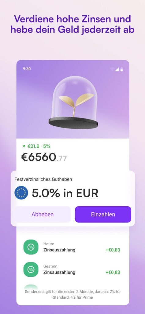 Sollzinsen nein, Guthabenzinsen ja: Vivid bietet im Rahmen des Enterprise+ Modells ein Tagesgeldkonto mit einer Aktionsverzinsung von 4,00 Prozent p.a. für vier Monate an. Danach greift der variable Zins von derzeit Prozent im Jahr.