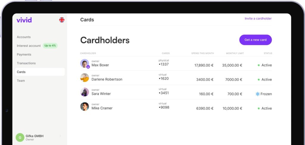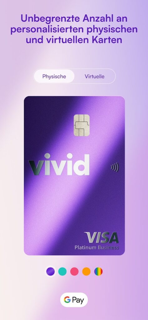 Mit Vivid Enterprise+ stehen Kunden virtuelle und physische Kreditkarten – auf Wunsch und gegen eine einmalige Gebühr von 19,90 € auch aus Metall – zur Verfügung. Das eröffnet alle Möglichkeiten, die Kreditkarten im Tagesgeschäft bieten. Zahlungen können online oder vor Ort im Geschäft getätigt werden. Hierfür lassen sich die Karten auch in mobile Bezahlsysteme wie Apple Pay integrieren.