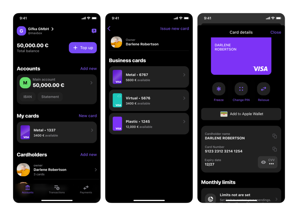 Die Buchungen der Konten und Geschäftskreditkarten können jederzeit über die Apps eingesehen werden. Viel wichtiger aber, gerade im Kontext der Karten: Für jede einzelne Kreditkarte und jedes Teammitglied lassen sich individuelle Limits und weitere Vorgaben definieren. Wie weit diese Limits im aktuellen Monat bereits ausgeschöpft wurden und wofür, geht aus den Übersichts- und Detail-Seiten hervor. Auch dem Thema Sicherheit werden die Apps gerecht, da die Karten mit einem Mausklick eingefroren und damit gesperrt werden können.