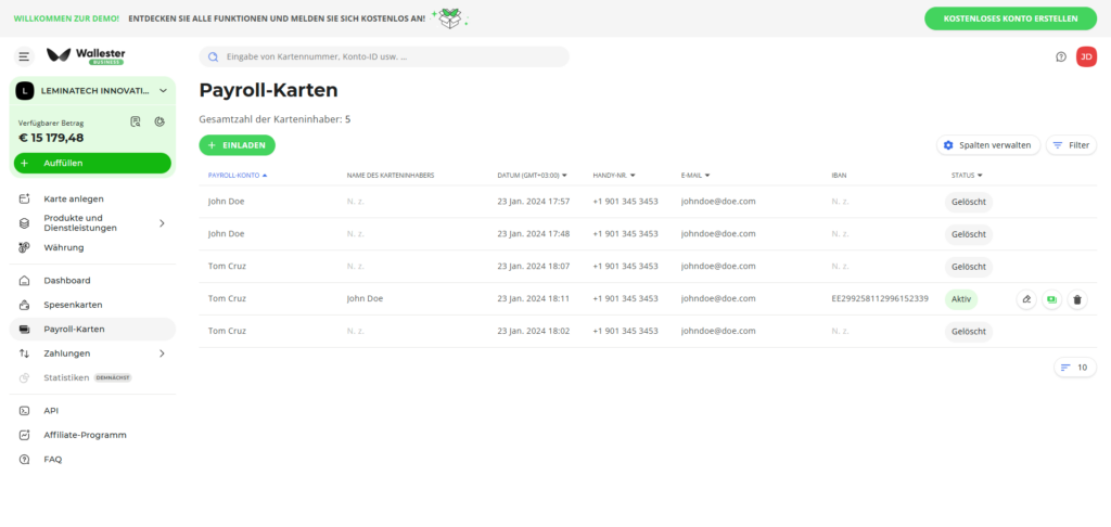 Den gleichen Funktionsumfang bietet die App von Wallester. Somit hat man zwei Optionen, um die kostenlosen Kreditkarten und das dazugehörige Geschäftskonto zu verwalten.