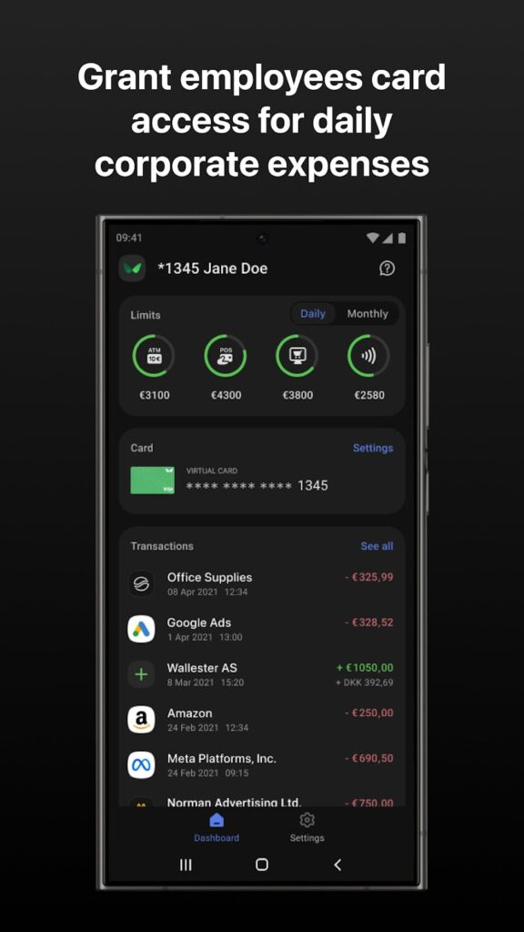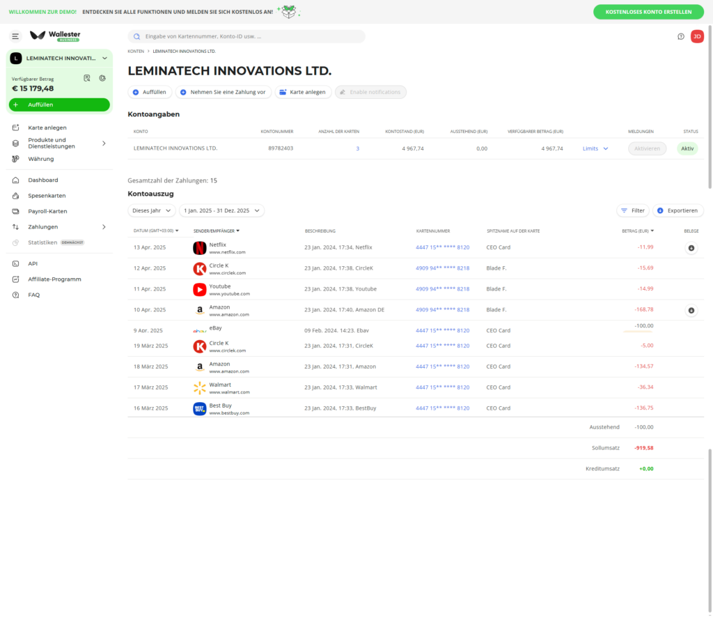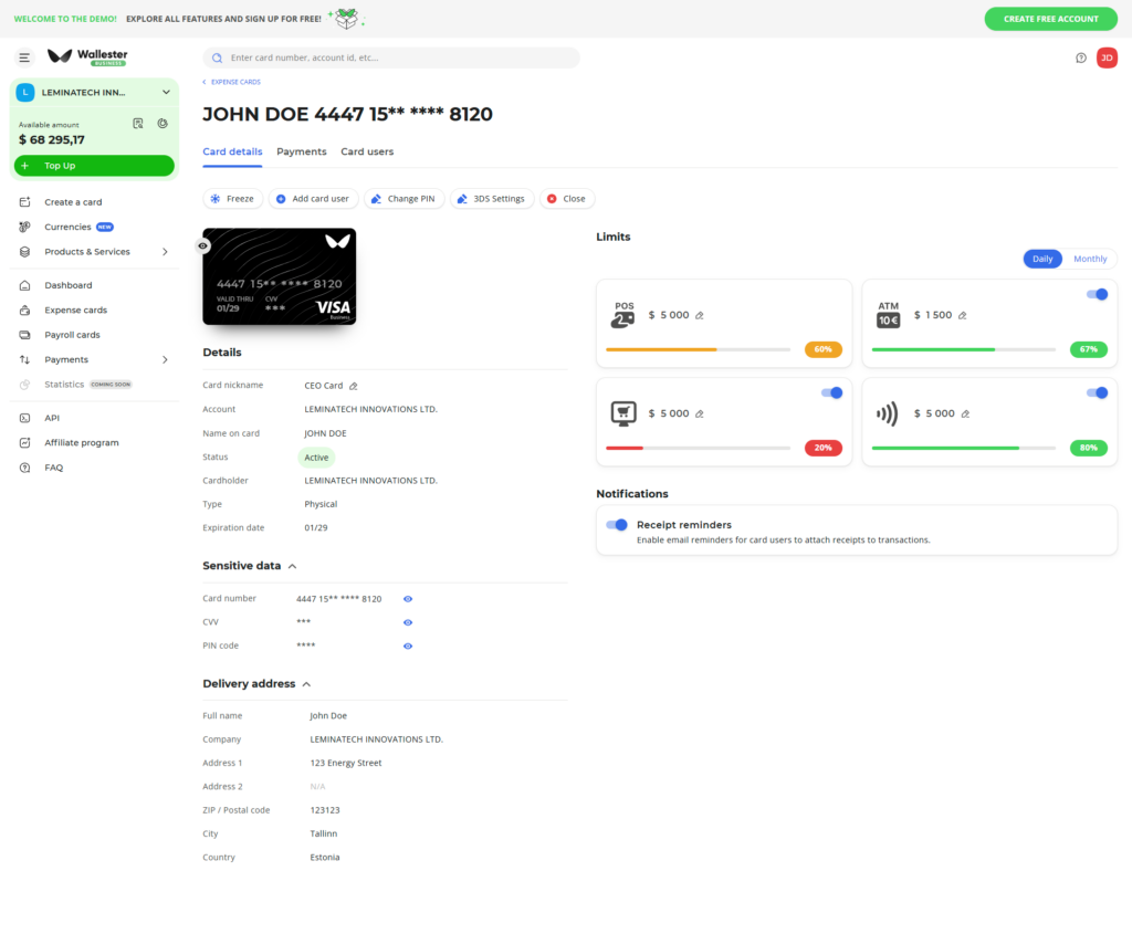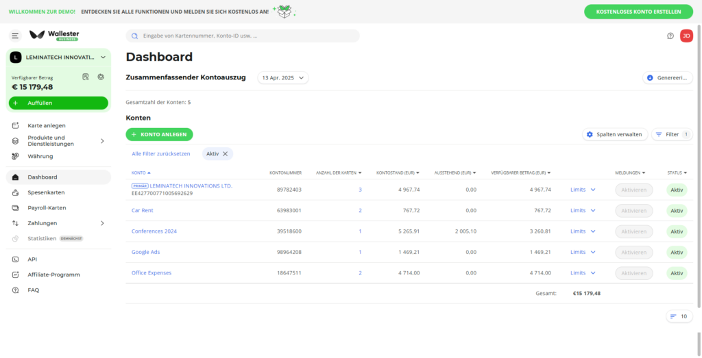 SeitensWallester werden Standardlimits für das Kartenkonto und die Karten vorgegeben: 25.000 € als Ausfalllimit des Unternehmens und Kontolimit, 15.000 € als Kartenlimit und als Auszahlungsgrenze 5000.00 €. Diese Werte lassen sich jederzeit in individuelle Limits ändern.