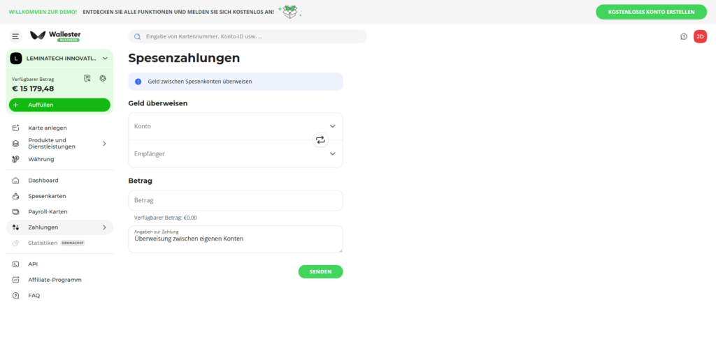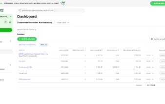 Im Zentrum des Portals steht ein Dashboard, das über das Hauptkonto und die bereits eingerichteten Unterkonten informiert. Per Mausklick gelangt man zu den einzelnen Bereichen und kann sich dort über die bisherigen Transaktionen informieren. Über das Menü auf der linken Seite ist es dann möglich, weitere Konten, Nutzer und Karten einzurichten.